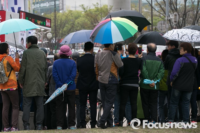 (부산=포커스뉴스) 3일 오후 부산광역시 사상구 광장로의 한 대형마트 앞에서 시민들이 손수조 새누리당 사상구 후보 유세를 보고 있다.