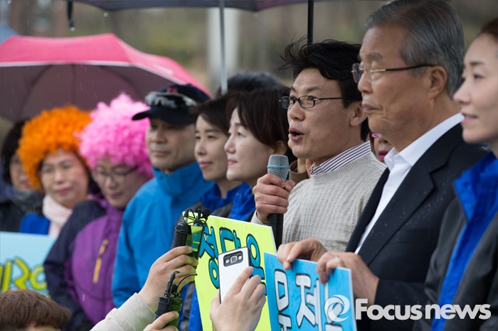 (서울=포커스뉴스) 3일 오후 서울 강서구 방화근린공원 일대에서 김종인 더불어민주당 비대위 대표 겸 선대위원장이 진성준 강서을 후보와 함께 유세를 하고 있다.