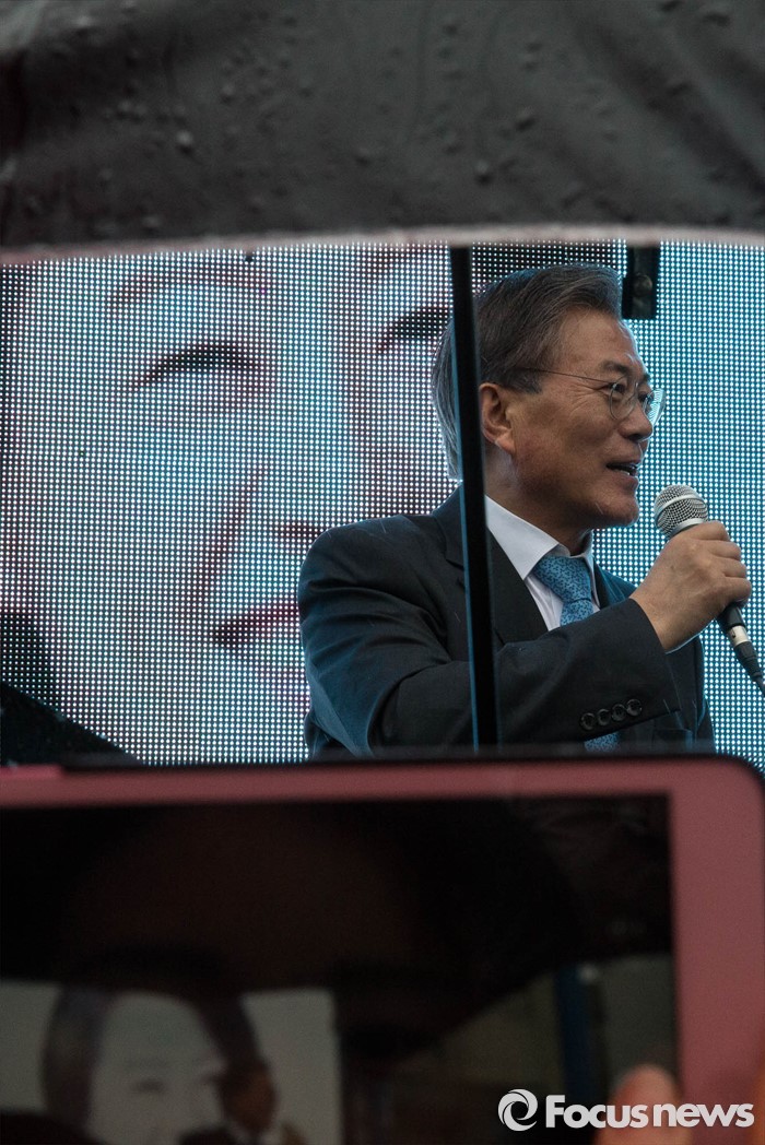 (서울=포커스뉴스) 선거운동이 시작되고 첫 주말을 맞은 3일 오후 문재인 전 더불어민주당 대표가 서울 강동구 암사시장에서 진선미 더불어민주당 강동구갑 후보와 합동유세를 하고 있다.