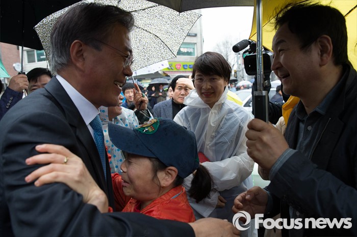 (서울=포커스뉴스) 선거운동이 시작되고 첫 주말을 맞은 3일 오후 문재인 전 더불어민주당 대표가 서울 강동구 암사시장에서 진선미 더불어민주당 강동구갑 후보와 합동유세를 하고 있다.