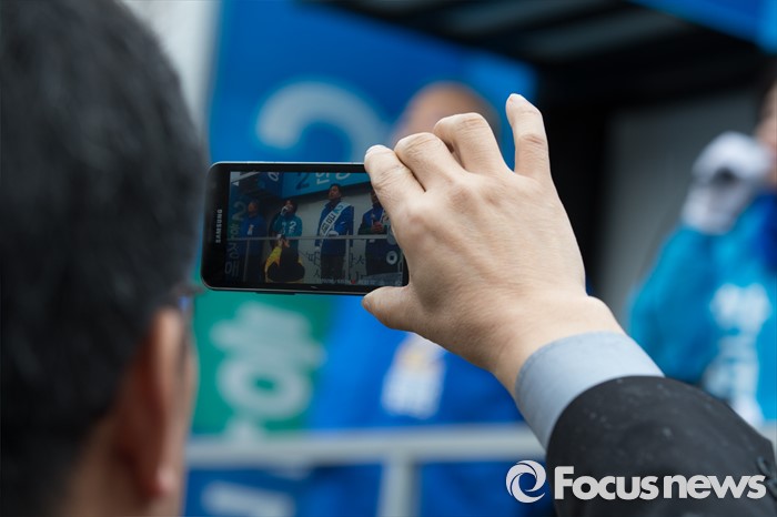 (서울=포커스뉴스) 3일 오후 서울 강서구 화곡역 사거리에서 김종인 더불어민주당 비대위 대표 겸 선대위원장이 강서갑 금태섭, 강서병 한정애 후보와 함께 유세를 하고 있는 모습을 한 지지자가 휴대폰에 담고 있다.