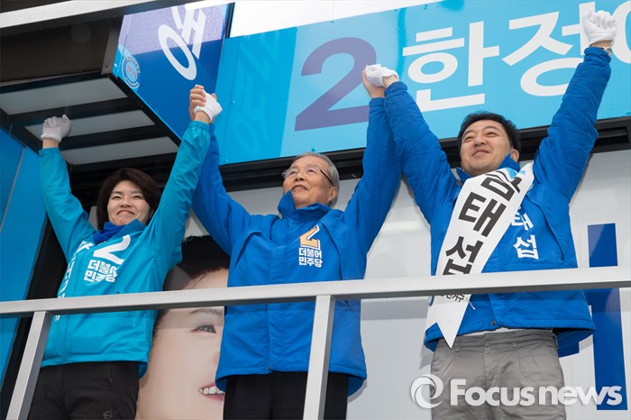 (서울=포커스뉴스) 3일 오후 서울 강서구 화곡역 사거리에서 김종인 더불어민주당 비대위 대표 겸 선대위원장이 강서갑 금태섭, 강서병 한정애 후보와 함께 유세를 하고 있다.