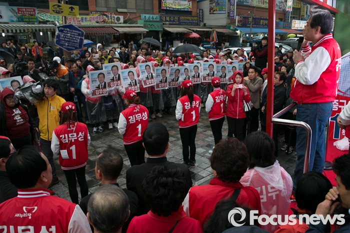 (부산=포커스뉴스) 부산광역시 중구영도구에 출마한 김무성 새누리당 대표가 3일 오후 부산시 중구 자갈치시장 공동어패류조합 앞에서 유세를 하고 있다.