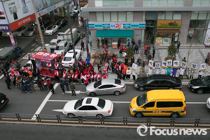 (부산=포커스뉴스) 부산광역시 중구영도구에 출마한 김무성(왼쪽) 새누리당 대표가 3일 오후 부산시 영도구 남항시장 입구에서 유세를 하는 동안, 같은 지역구에 출마한 이선자 무소속 후보 선거운동원들이 피켓을 들고 있다.