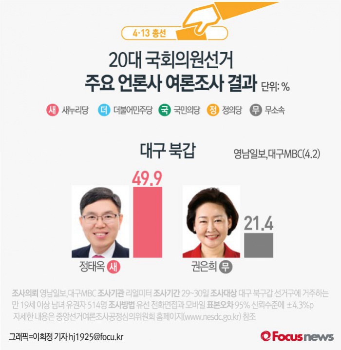 (서울=포커스뉴스) 영남일보, 대구MBC가 리얼미터에 의뢰해 2일 발표한 여론조사 결과에 따르면 새누리당 정태옥 후보의 지지율은 49.9%, 무소속 권은희 후보의 지지율은 21.4%를 기록했다.