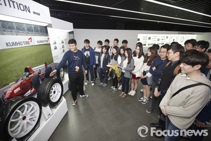 박유성 금호타이어 HR담당 상무는 “금호타이어 R&D 네트워크 허브인 중앙연구소는 최고의 연구인력 양성을 통해 업계를 선도하는 타이어 기술력의 메카로 자리매김할 것”이라고 말했다.금호타이어가 지난 2일 이공계 대학생들을 경기도 용인에 위치한 중앙연구소에 초청해 채용설명회를 열였다. 중앙연구소 투어와 함께 쇼룸에서 타이어 관련 정보를 듣고 있는 학생들 <사진제공=금호타이어>