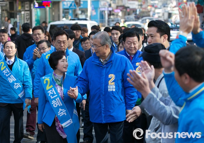 (서울=포커스뉴스) 4일 오전 전혜숙 더불어민주당 서울 광진갑 후보 선거사무소에서 중앙선거대책위원회의를 마친 김종인 비대위 대표 겸 선대위원장과 전 후보가 손을 잡고 유세차량으로 이동하고 있다.
