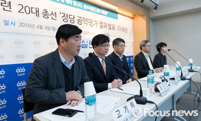(서울=포커스뉴스) 4일 오전 서울 종로구 경제정의실천시민연합에서 고계현(왼쪽) 경실련 사무총장 20대 총선 정당 공약평가 결과발표 기자회견을 하고 있다.