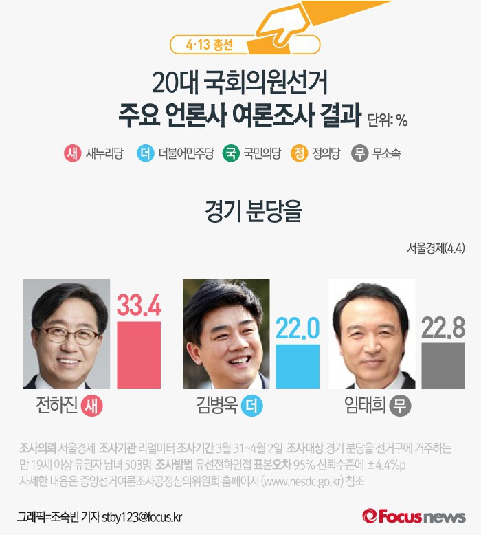 (서울=포커스뉴스) 서울경제가 리얼미터에 의뢰해 3월 31일부터 4월 2일까지 경기 분당을에 거주하는 유권자 503명을 대상으로 여론조사를 실시한 결과, 여권의 표가 분산됐음에도 불구하고 새누리당 전하진 후보가 33.4%의 지지율을 보이며 임태희 무소속 후보(22.8%), 김병욱 더민주 후보(22.0%)를 앞섰다.