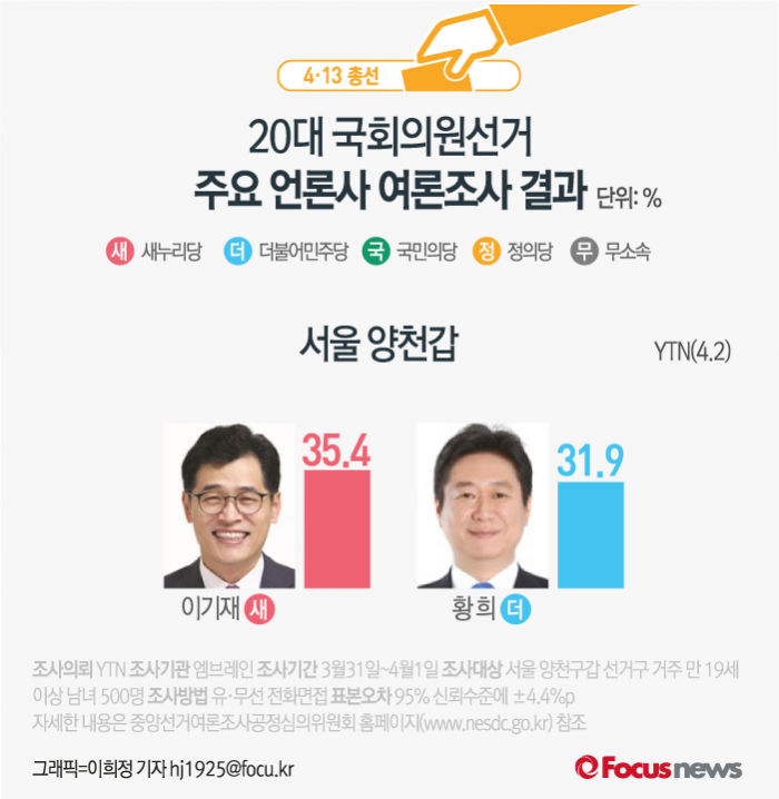 (서울=포커스뉴스) YTN이 엠브레인에 의뢰해 2일 발표한 여론조사 결과에 따르면 새누리당 이기재 후보의 지지율은 35.4%, 더불어민주당 황희 후보의 지지율은 31.9%를 기록했다.