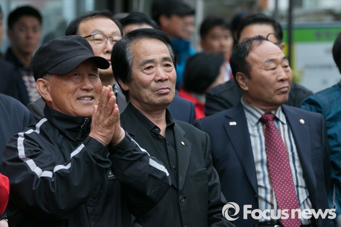 (창원=포커스뉴스) 4일 오전 경남 창원시 성산구 가음정시장 앞에서 시민들이 강기윤 창원시성산 후보 지원유세를 보고 있다.