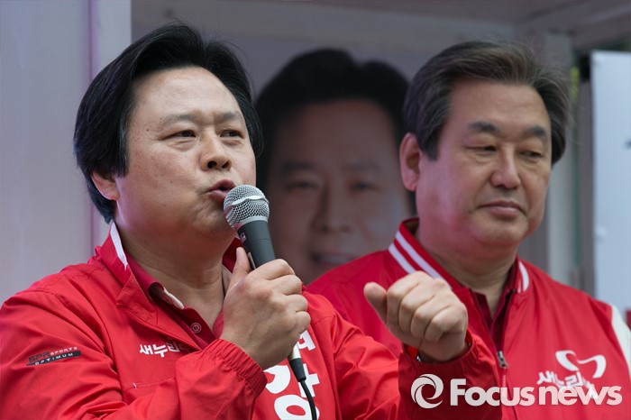 (창원=포커스뉴스) 4일 오전 경남 창원시 성산구 가음정시장 앞에서 강기윤(왼쪽) 창원시성산 후보가 유세를 하고 있다.