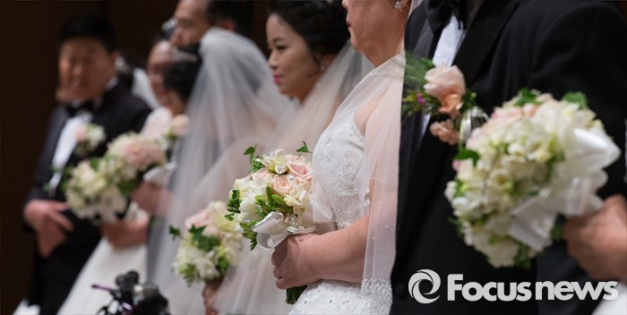 (대전=포커스뉴스) 4일 오전 대전 유성구 호텔ICC에서 열린 제18회 대전장애인자활실천대회 및 합동결혼식에서 신랑과 신부가 주례사를 듣고 있다.
