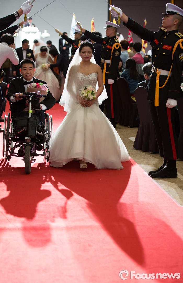 (대전=포커스뉴스) 4일 오전 대전 유성구 호텔ICC에서 열린 제18회 대전장애인자활실천대회 및 합동결혼식에서 신랑과 신부가 행진을 하고 있다.