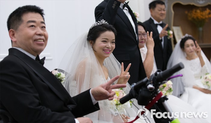 (대전=포커스뉴스) 4일 오전 대전 유성구 호텔ICC에서 열린 제18회 대전장애인자활실천대회 및 합동결혼식에서 신랑과 신부가 밝은 모습을 보이고 있다.