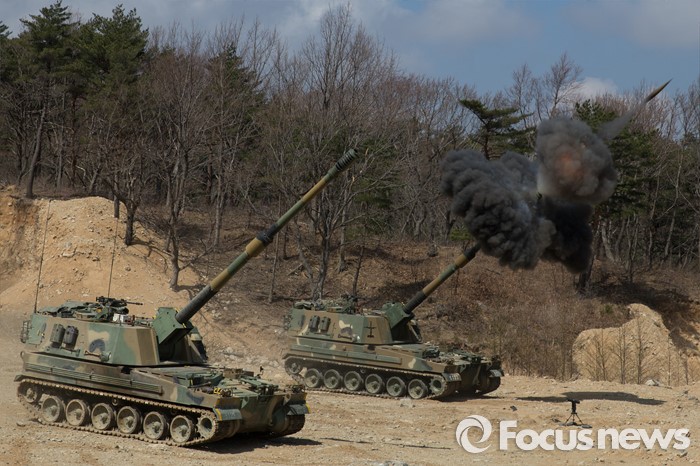 (고성=포커스뉴스) 4일 오전 강원도 고성 야촌리사격장에서 열린 '2016년 전반기 해상사격 훈련'에서 육군 8군단 포병대대 소속 K-9 자주포가 사격을 하고 있다.