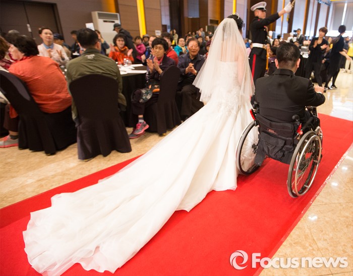 (대전=포커스뉴스) 4일 오전 대전 유성구 호텔ICC에서 열린 제18회 대전장애인자활실천대회 및 합동결혼식에서 신랑과 신부가 행진을 하고 있다.