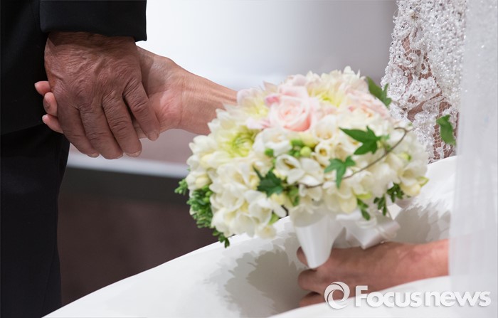 (대전=포커스뉴스) 4일 오전 대전 유성구 호텔ICC에서 열린 제18회 대전장애인자활실천대회 및 합동결혼식에서 신랑과 신부가 주례사를 들으며 손을 잡고 있다.
