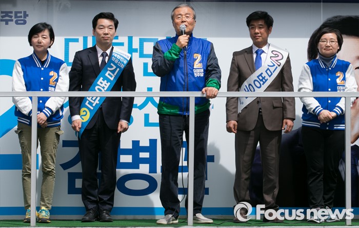 (성남=포커스뉴스) 4일 오후 경기도 서현역 인근 거리에서 열린 더불어민주당 성남 분당구 선거유세에 참석한 김종인 비대위 대표 겸 선대위원장이 지지를 호소하고 있다. 왼쪽부터 제윤경 비례대표 후보, 김병관 분당갑 후보, 김 대표, 김병욱 분당을 후보, 문미옥 비례대표 후보.