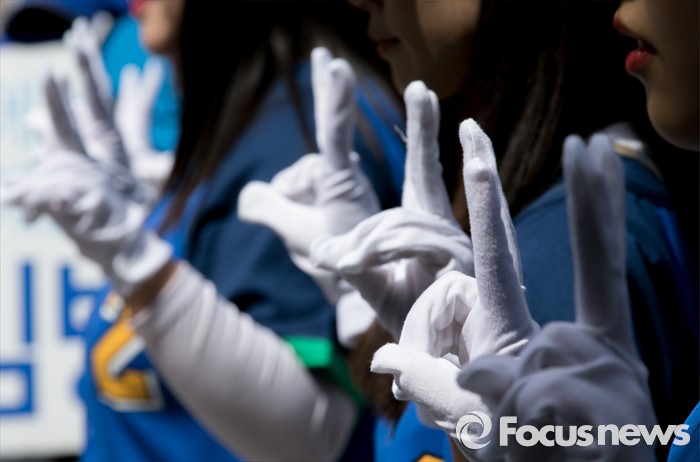 (성남=포커스뉴스) 4일 오후 경기도 서현역 인근 거리에서 열린 더불어민주당 성남 분당구 선거유세에 참여한 선거운동원들이 지지를 호소하고 있다.
