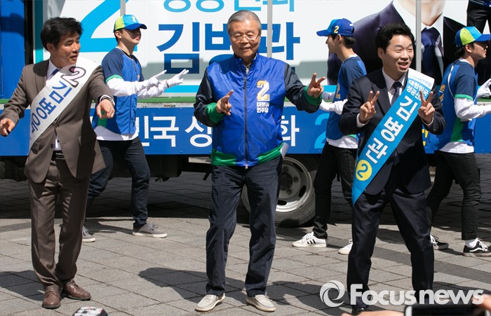 (성남=포커스뉴스) 4일 오후 경기도 서현역 인근 거리에서 열린 더불어민주당 성남 분당구 선거유세에 참석한 김종인(가운데) 비대위 대표 겸 선대위원장과 김병관(오른쪽) 분당갑, 김병욱 분당을 후보가 로고송에 맞춰 율동을 선보이고 있다.