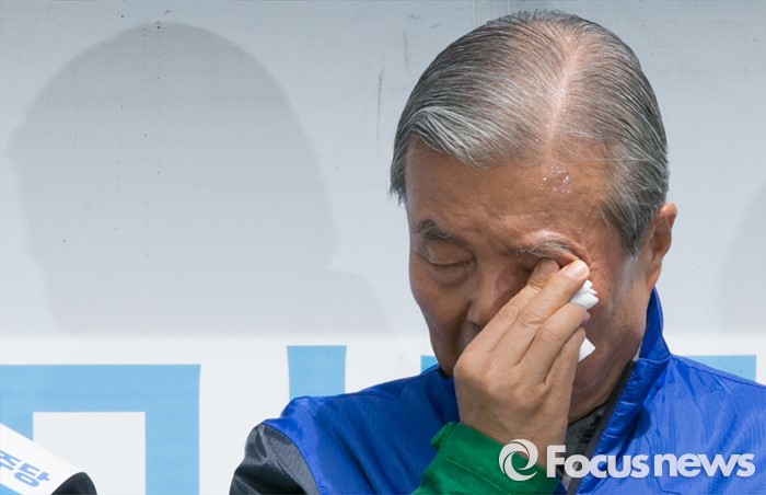 (성남=포커스뉴스) 4일 오후 경기도 서현역 인근 거리에서 열린 더불어민주당 성남 분당구 선거유세에 참석한 김종인 비대위 대표 겸 선대위원장이 땀을 닦고 있다.