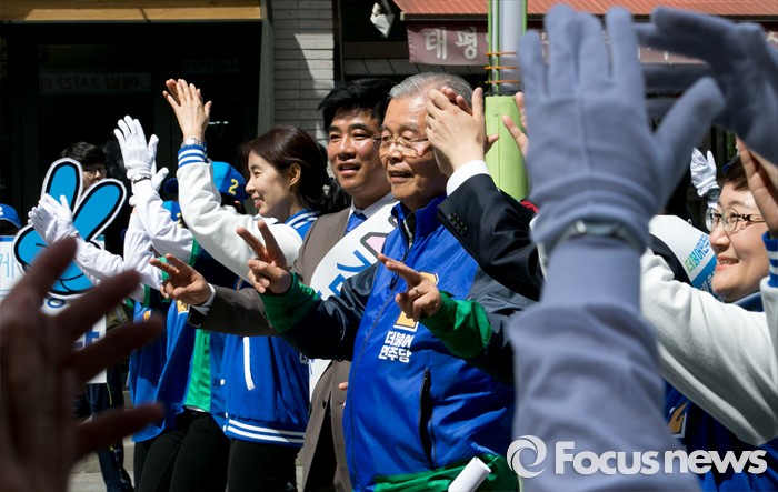 (성남=포커스뉴스) 4일 오후 경기도 서현역 인근 거리에서 열린 더불어민주당 성남 분당구 선거유세에 참석한 김종인 비대위 대표 겸 선대위원장과 김병관 분당갑, 김병욱 분당을 후보, 비례대표 후보들이 로고송에 맞춰 율동을 선보이고 있다.