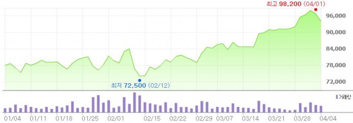 그는 "올해 연간 실적은 전년 대비 50% 개선될 것"이라며 매출 14조6000억원, 영업이익 1조2126억원, 당기순이익 9942억원을 예상했다.최근 3개월간 에쓰오일 주가 추이 <그래픽출처=네이버>