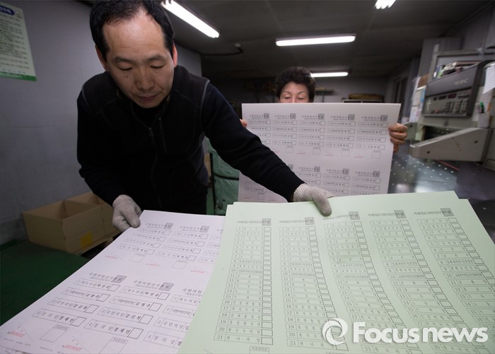 (서울=포커스뉴스) 제20대 국회의원 선거를 9일 앞둔 4일 오후 서울 영등포구 한 인쇄소에서 직원들이 투표용지 인쇄 작업을 하고 있다.