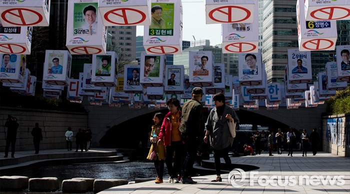 (서울=포커스뉴스) 4일 오후 서울 청계천 모전교에서 광통교 사이에 4.13 제20대 국회의원선거를 알리는 조형물이 설치돼 있다.