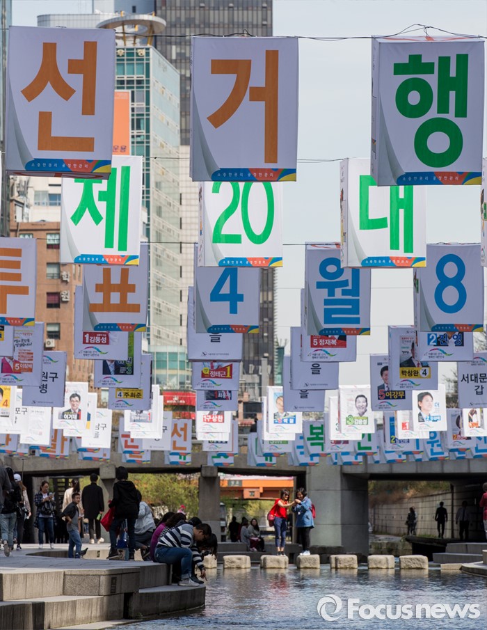 (서울=포커스뉴스) 4일 오후 서울 청계천 모전교에서 광통교 사이에 4.13 제20대 국회의원선거를 알리는 조형물이 설치돼 있다.