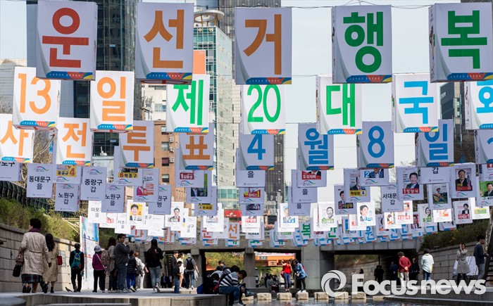 (서울=포커스뉴스) 4일 오후 서울 청계천 모전교에서 광통교 사이에 4.13 제20대 국회의원선거를 알리는 조형물이 설치돼 있다.