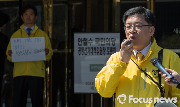 (서울=포커스뉴스) 4일 오후 서울 종로구 세종문화회관 앞에서 열린 '정의당, 방송기자클럽 초청 토론회 배제에 대한 항의 긴급기자회견'에 참석한 이혁재 사무총장이 규탄발언을 하고 있다.