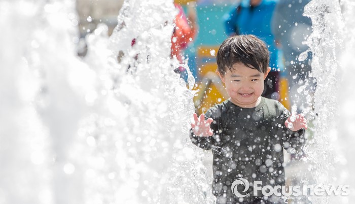 (서울=포커스뉴스) 4일 오후 서울 광화문광장 분수대에서 한 어린이가 물장난을 치고 있다.
