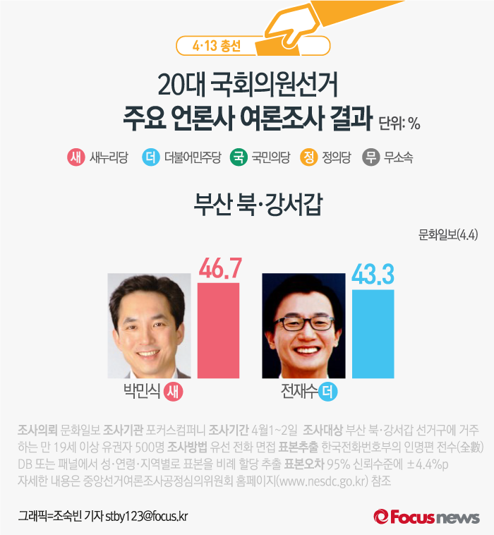 (서울=포커스뉴스) 문화일보가 포커스컴퍼니에 의뢰해 4월1일부터 2일까지 부산 북·강서갑 선거구에 거주하는 유권자 500명에게 여론조사를 실시한 결과, 새누리당의 박민식 후보의 지지율은 46.7%, 더민주 전재수 후보의 지지율은 43.3%로 오차범위내 접전을 벌이고 있는 것으로 나타났다.