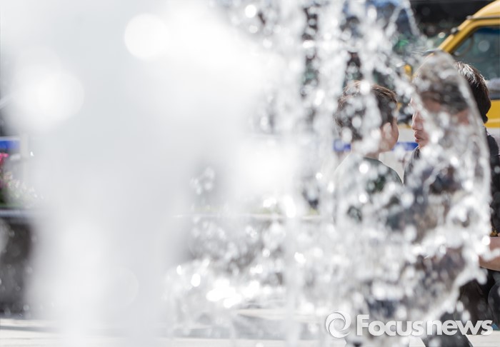 (서울=포커스뉴스) 4일 오후 서울 광화문광장 분수대에서 한 어린이가 아빠와 물장난을 치고 있다.