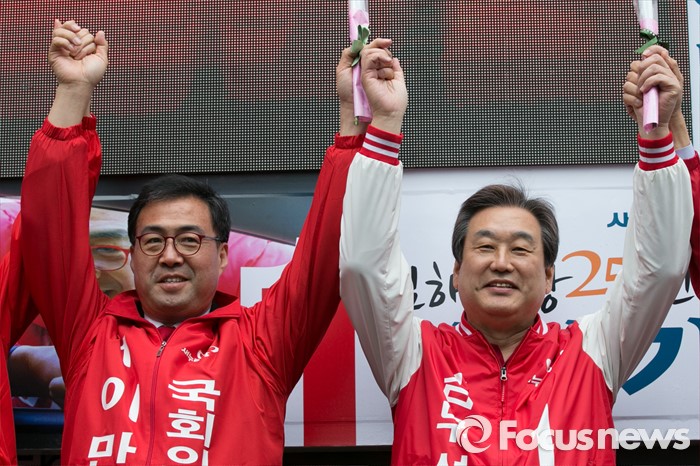 (김해=포커스뉴스) 김무성(오른쪽) 새누리당 대표가 4일 오후 경남 김해시 내외로 외동전통시장 앞에서 이만기 김해을 후보 지원유세에 참석해, 이 후보와 손을 들고 있다.