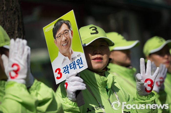 (서울=포커스뉴스) 국민의당 선거운동원들이 4일 오후 서울 용산구 용문시장에서 곽태원 용산구 후보 지원유세를 하고 있다.