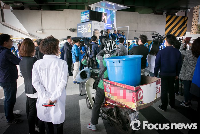 (용인=포커스뉴스) 4일 오후 경기도 이마트 죽전점 앞 광장에서 시민 및 지지자들이 더불어민주당 용인지역 합동유세를 지켜보고 있다.