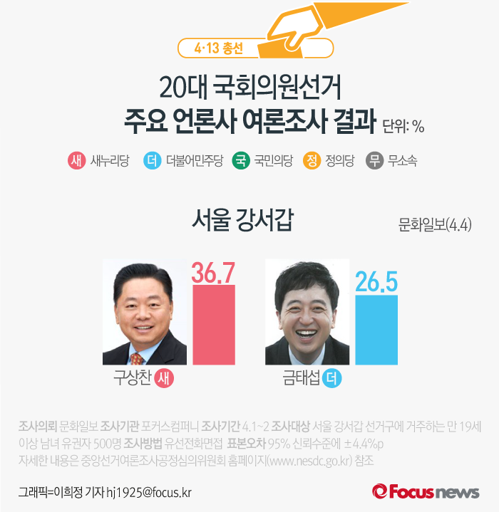 (서울=포커스뉴스) 문화일보가 포커스컴퍼니에 의뢰해 4일 발표한 여론조사 결과에 따르면 새누리당 구상찬 후보의 지지율은 36.7%, 더불어민주당 금태섭 후보의 지지율은 26.5%를 기록했다.