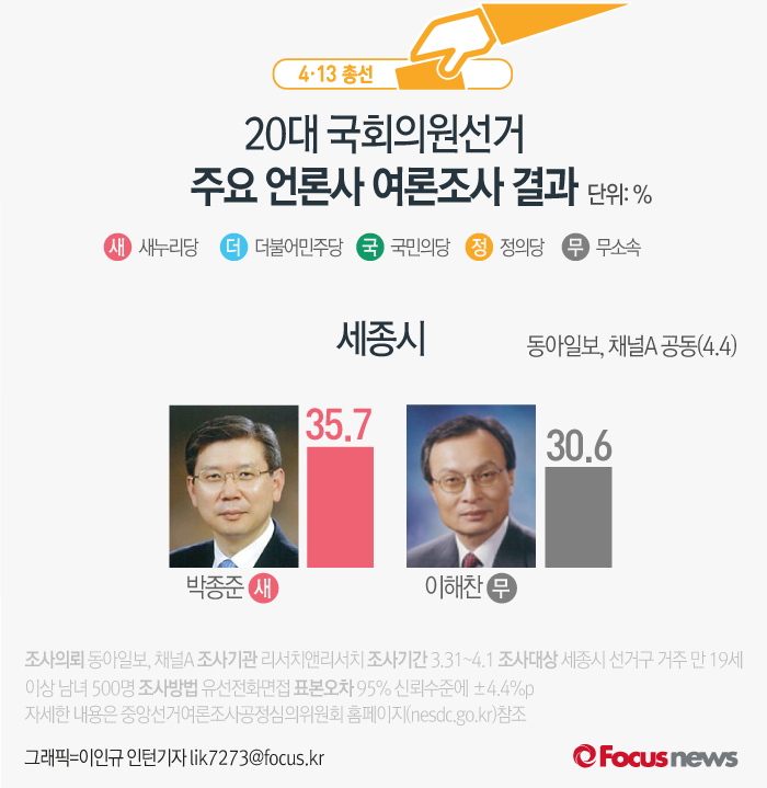 (서울=포커스뉴스) 동아일보, 채널A가 리서치앤리서치에 의뢰해 4일 발표한 여론조사 결과에 따르면 새누리당 박종준 후보의 지지율은 35.7%, 무소속 이해찬 후보는 30.6%를 기록했다.