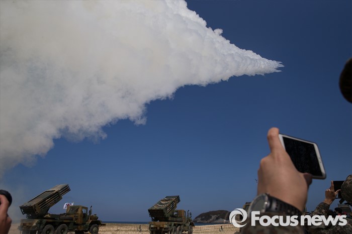 (고성=포커스뉴스) 4일 오후 강원도 고성 송지호해변에서 열린 '2016년 전반기 해상사격 훈련'에서 육군 8군단 포병대대 소속 130mm 다련장 구룡이 로켓탄을 발사하고 있다.