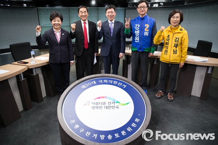 (서울=포커스뉴스) 총선을 9일 앞둔 4일 오후 서울 양천구 양천벤처타운에서 열린 지역방송 토론회에 참석한 은평구을 후보들이 기념촬영을 하고 있다. 왼쪽부터 고연호 국민의당, 이재오 무소속 후보, 사회자, 강병원 더불어민주당 후보, 김제남 정의당 후보.