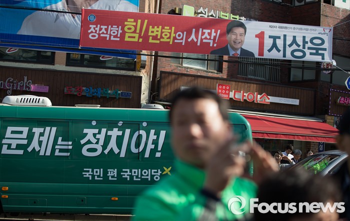 (서울=포커스뉴스) 정호준 국민의당 성동구을 후보가 4일 오후 서울 성동구 금남시장 로터리에서 선거 유세를 하고있는 가운데 선거 각 정당들의 선거 현수막들이 보이고 있다.