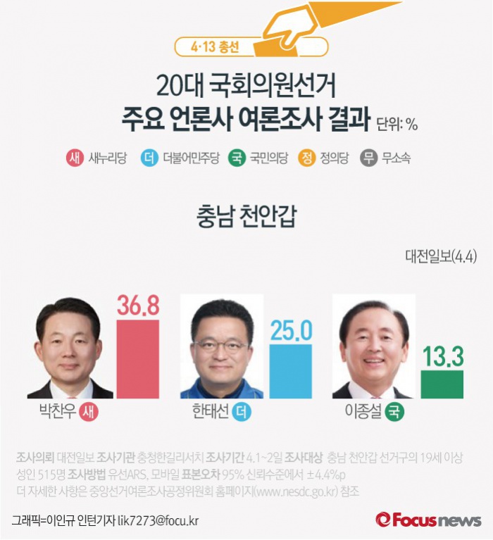 (서울=포커스뉴스) 대전일보가 여론조사기관 충청한길리서치에 의뢰해 4일 발표한 결과에 따르면 충남 천안갑은 박찬우 새누리당 후보(36.8%), 한태선 더민주 후보(25.0%), 이어 이종설 국민의당 후보(13.3%), 이명성 무소속 후보(4.8%)순으로 조사됐다.