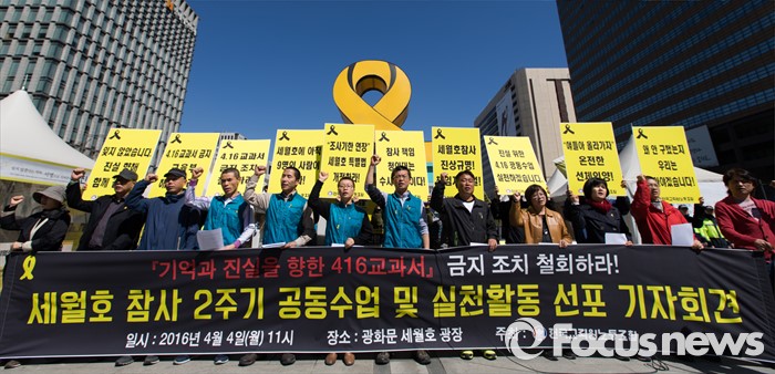 전교조는 4일 오전 11시 서울 종로구 광화문광장에서 '세월호 참사 2주기 공동수업 및 실천활동 선포 기자회견'을 열고 "'기억과 진실을 향한 4·16교과서'는 세월호 참사에 대한 건전한 토론과 비판을 위해 만든 정상적인 교육자료"라며 "교사들은 주어진 수업권을 행사할 것"이라고 말했다.