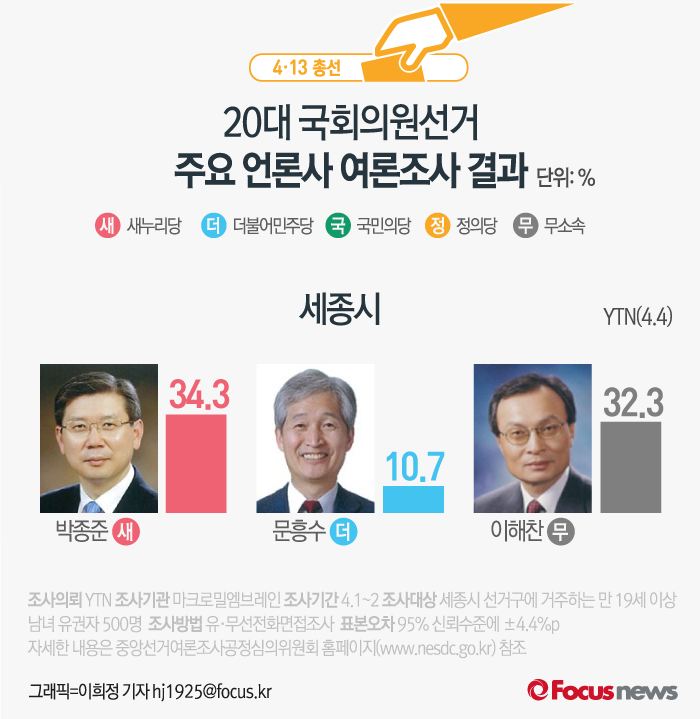 (서울=포커스뉴스) YTN이 마이로밀엠브레인에 의뢰해 4일 발표한 여론조사 결과에 따르면 새누리당 박종준 후보의 지지율은 34.3%, 더불어민주당 문흥수 후보의 지지율은 10.7%, 무소속 이해찬 후보는 32.3%를 기록했다.