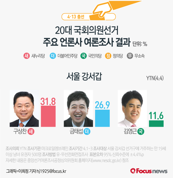 (서울=포커스뉴스) YTN이 마이로밀엠브레인에 의뢰해 4일 발표한 여론조사 결과에 따르면 새누리당 구상찬 후보의 지지율은 31.8%, 더불어민주당 금태섭 후보의 지지율은 26.9%, 국민의당 김영근 후보는 11.6%를 기록했다.