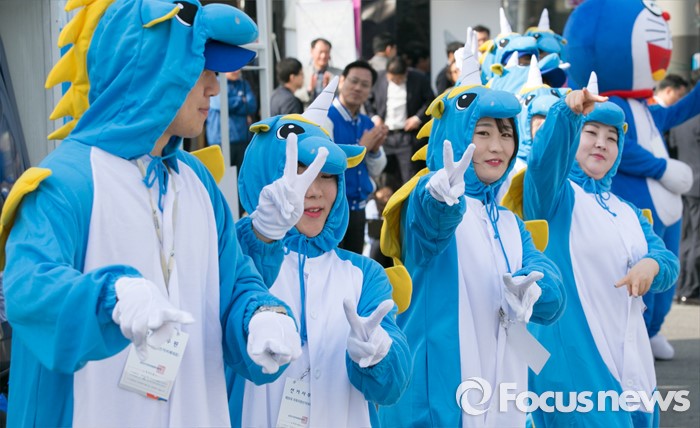(수원=포커스뉴스) 4일 오후 경기도 지하철 1호선 성균관대역 앞에서 열린 더불어민주당 수원지역 합동유세에 참여한 인형옷을 입은 선거운동원들이 로고송에 맞춰 율동을 선보이고 있다.