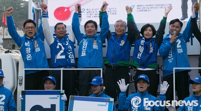 (수원=포커스뉴스) 4일 오후 경기도 수원 팔달문시장 앞에서 열린 더불어민주당 수원지역 합동유세에 참석한 김종인 비대위 대표 겸 선대위원장과 후보들이 만세를 외치며 지지를 호소하고 있다. 왼쪽부터 박광온 수원정, 이찬열 수원갑, 김진표 수원무 후보, 김 대표, 백혜련 수원을, 김영진 수원병 후보.